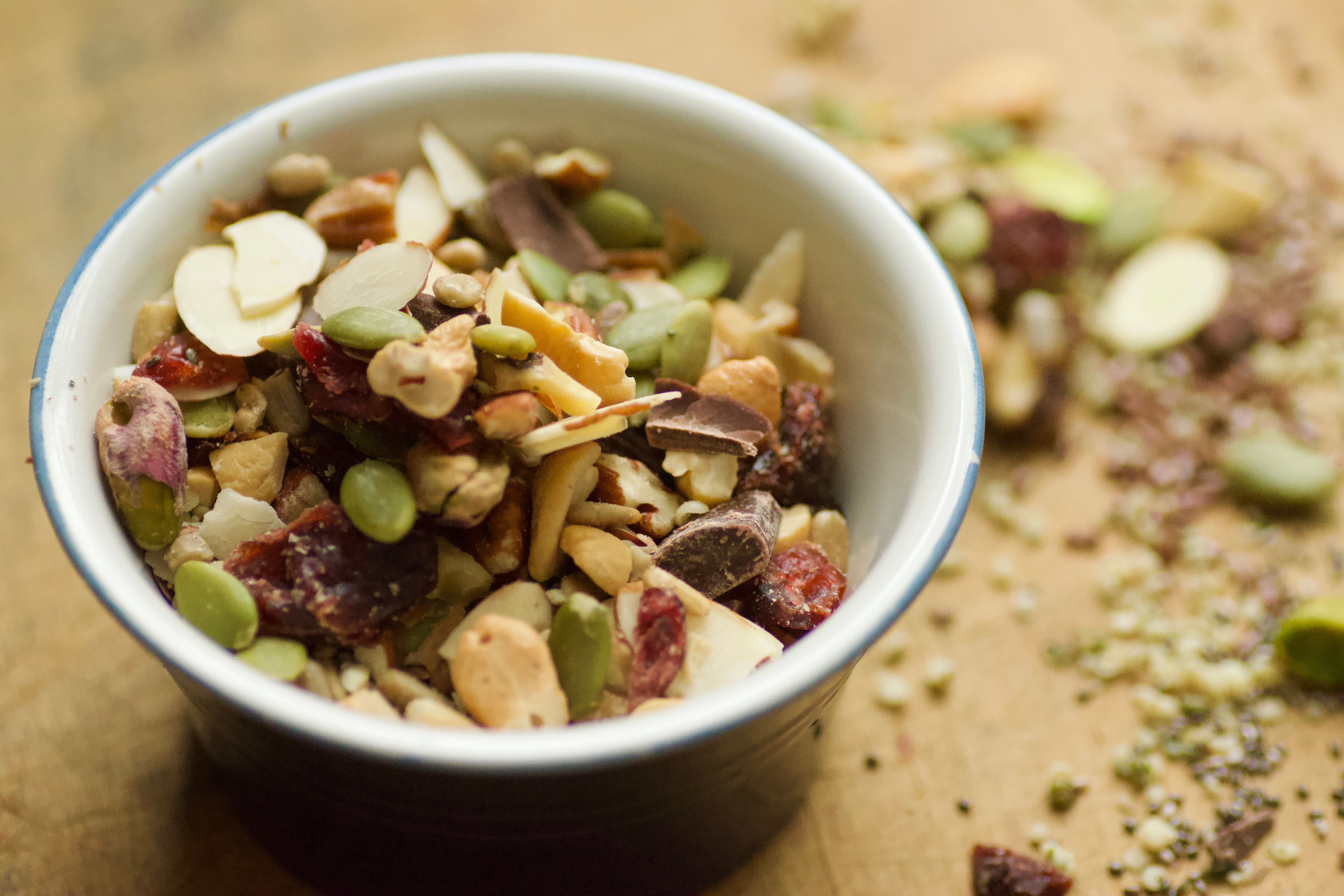 Given my penchant for salty and savory, I’ve been best friends with hot, buttered popcorn and potato chips for years. And I’m sure I’ll never give either up altogether, but I’ve found a new, healthier crunch in a concoction of nuts and seeds – a vitamin, mineral, and anti-oxidant packed trail mix of sorts – easy to buy, chop, mix, and eat.